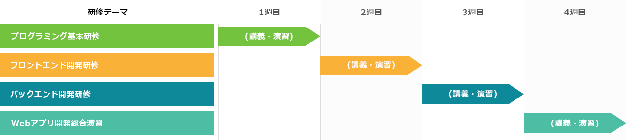 短期間で「基礎知識+現場感覚」を身につけ、研修修了後には自信を持ってプロジェクトに参画できるエンジニアへと成長することを目指します。
